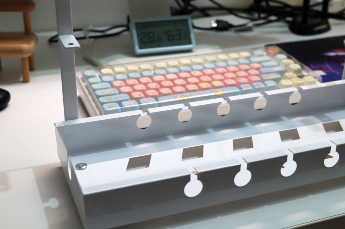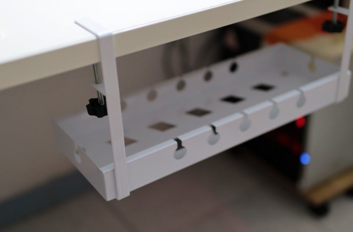 这次改造的重点就是解决这个问题,我用了两样小东西:磁吸线夹 + 桌下置物架。简单粗暴,但效果拔群。
