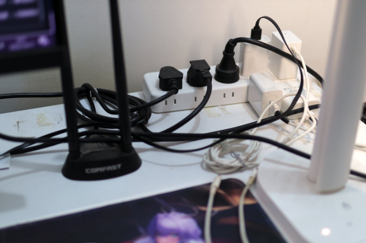 排插放在桌面上,一堆线也都在桌上,很乱。