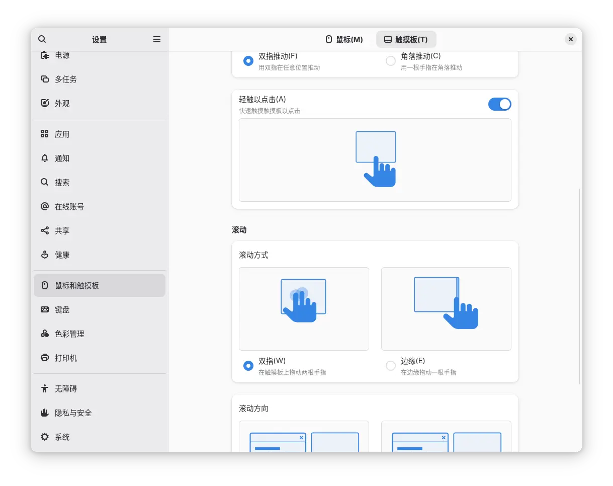 输入 & 交互 | 鼠标滚动方向可调,触控板边缘操作手势惊喜 | Wayland 下仍感觉卡顿,X11 又不够顺滑 |