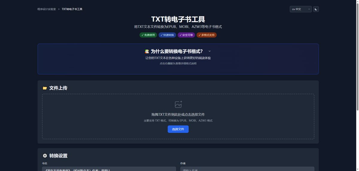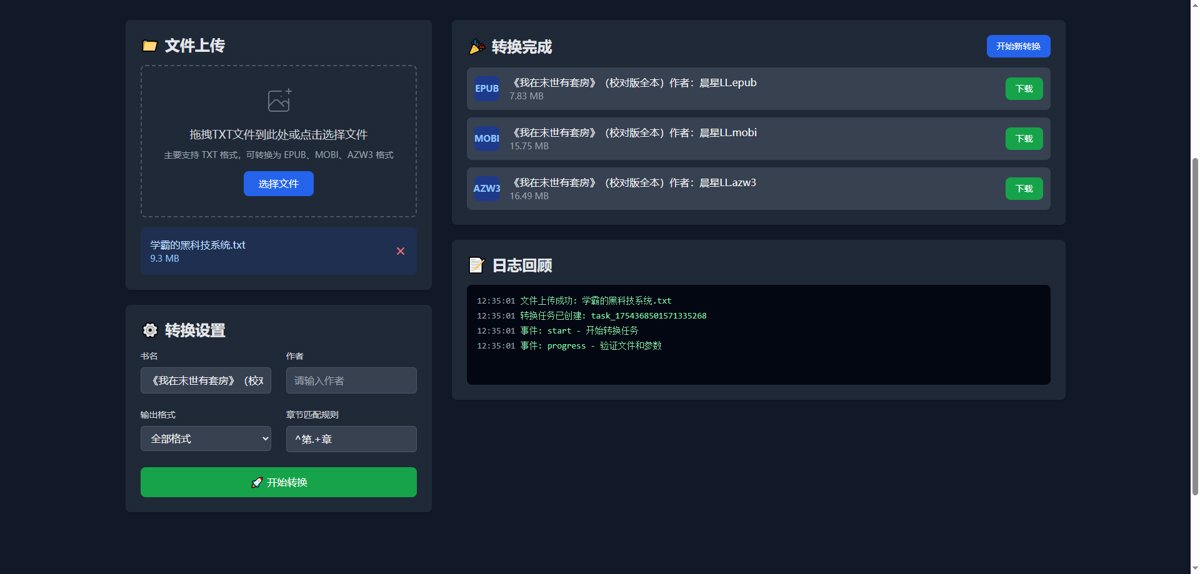 基于 Web 的小说转换工具,支持将 txt 文件转换为 epub、mobi、azw3 等电子书格式