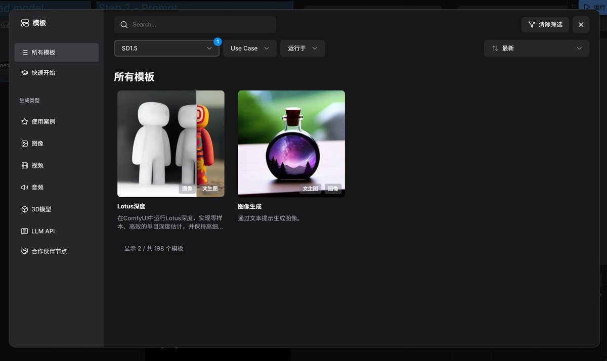 对于新手来说,不用急着自己搭建工作流,ComfyUI 内置了丰富的模板库,直接选用现成的模板就能快速上手。我这次用的是模板库中 SD1.5 模型的「图像生成」基础模板,适合入门尝试。