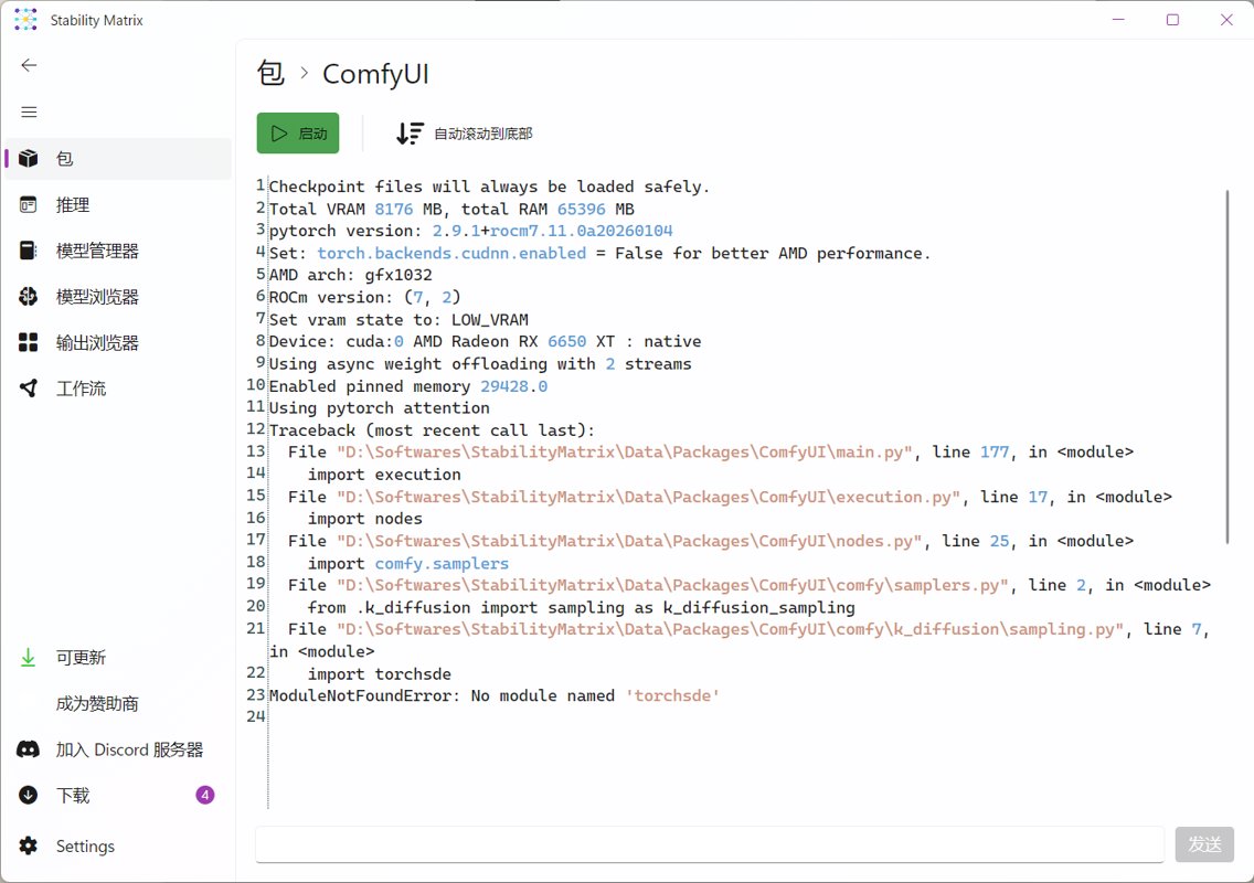 虽然报错了有点小尴尬,但是日志中的 Device: cuda:0 AMD Radeon RX 6650 XT : native 这一行非常迷人