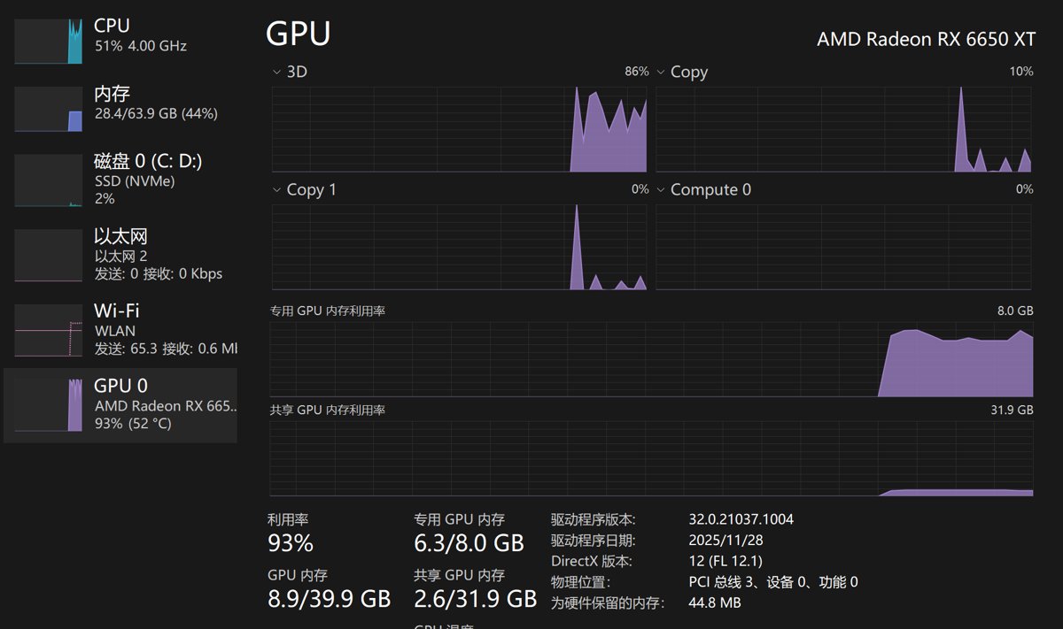 从任务管理器中能清晰看到,AMD 显卡的利用率直接拉满——这才是真正发挥出了 GPU 的性能优势!相比之前的 CNN 训练任务,AI 画图对算力的需求更高,也更能体现出 ROCm 环境搭建的价值。