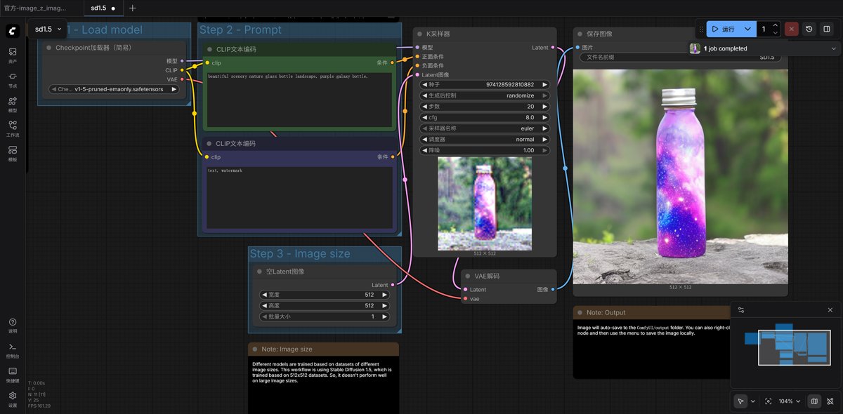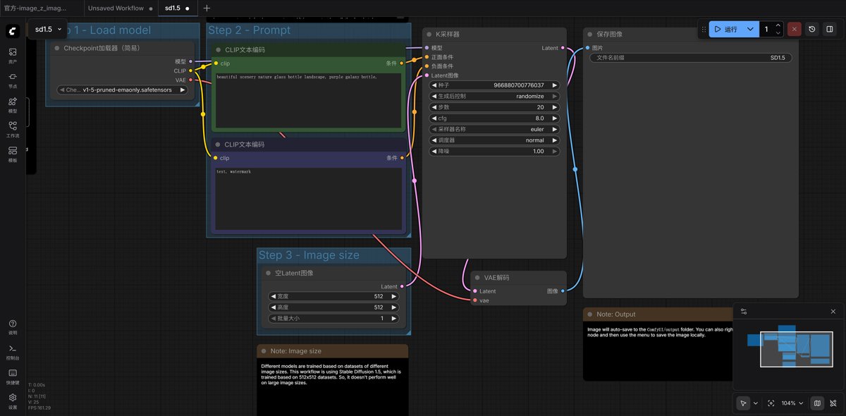 加载模板后,工作流的初始形态就出来了,包含了提示词输入、模型选择、采样器配置、图像输出等核心模块,后续可以根据自己的需求调整参数或添加模块:
