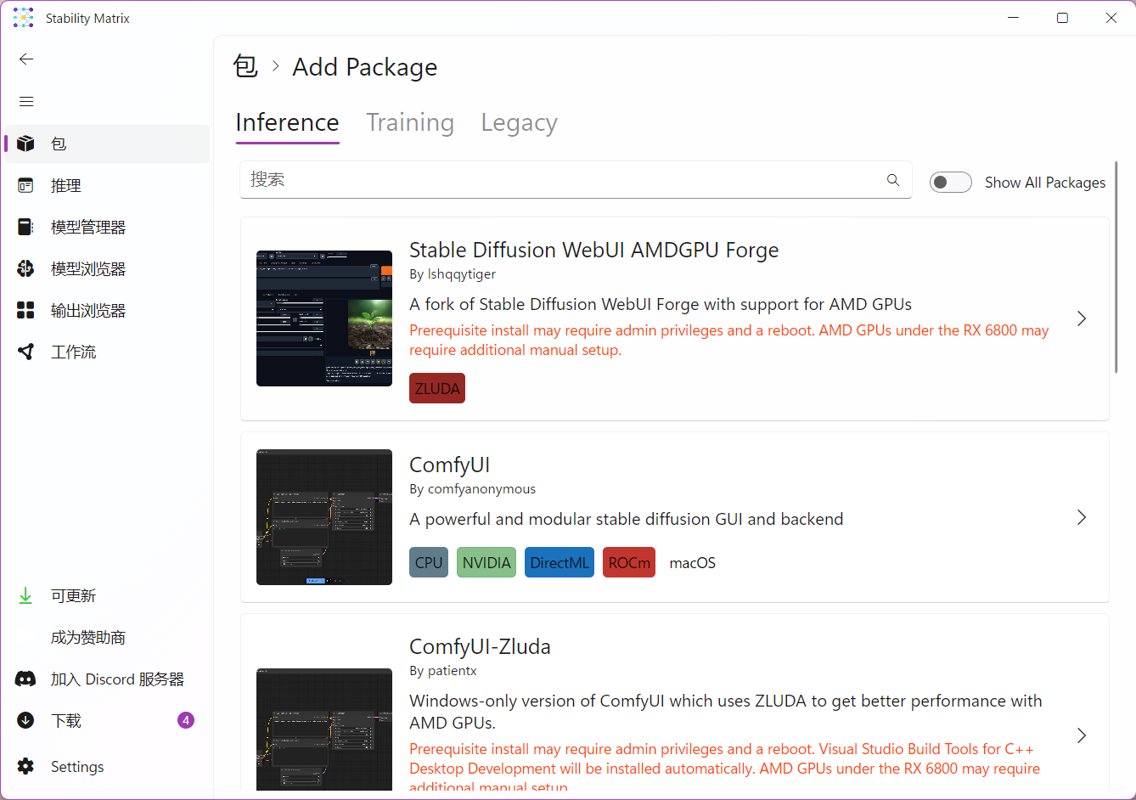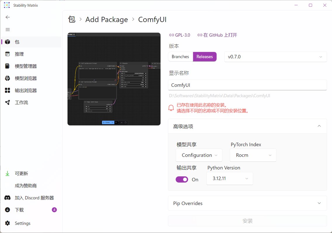 打开 StabilityMatrix 后,直接在包管理界面搜索并添加 ComfyUI 包即可。对于新手来说,这个方式最省心,能快速完成基础部署。
