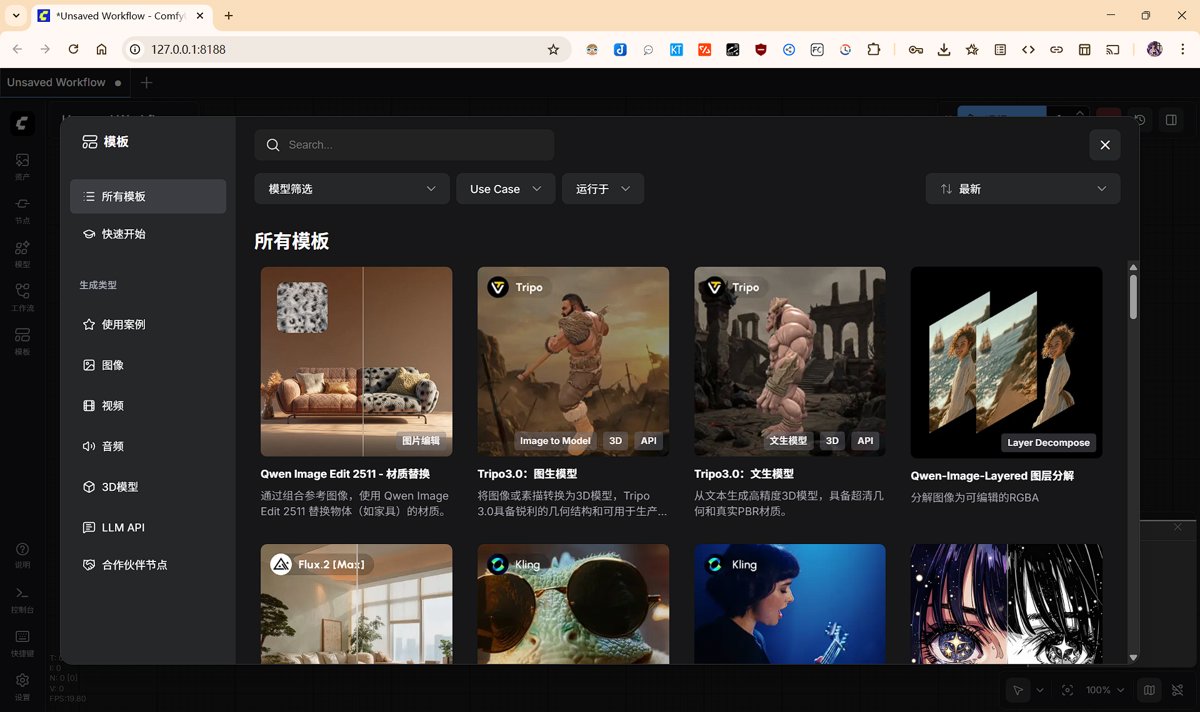 ComfyUI 启动成功后,在浏览器中访问日志提示的地址(默认是 http://127.0.0.1:8188),就能进入 ComfyUI 的操作界面。